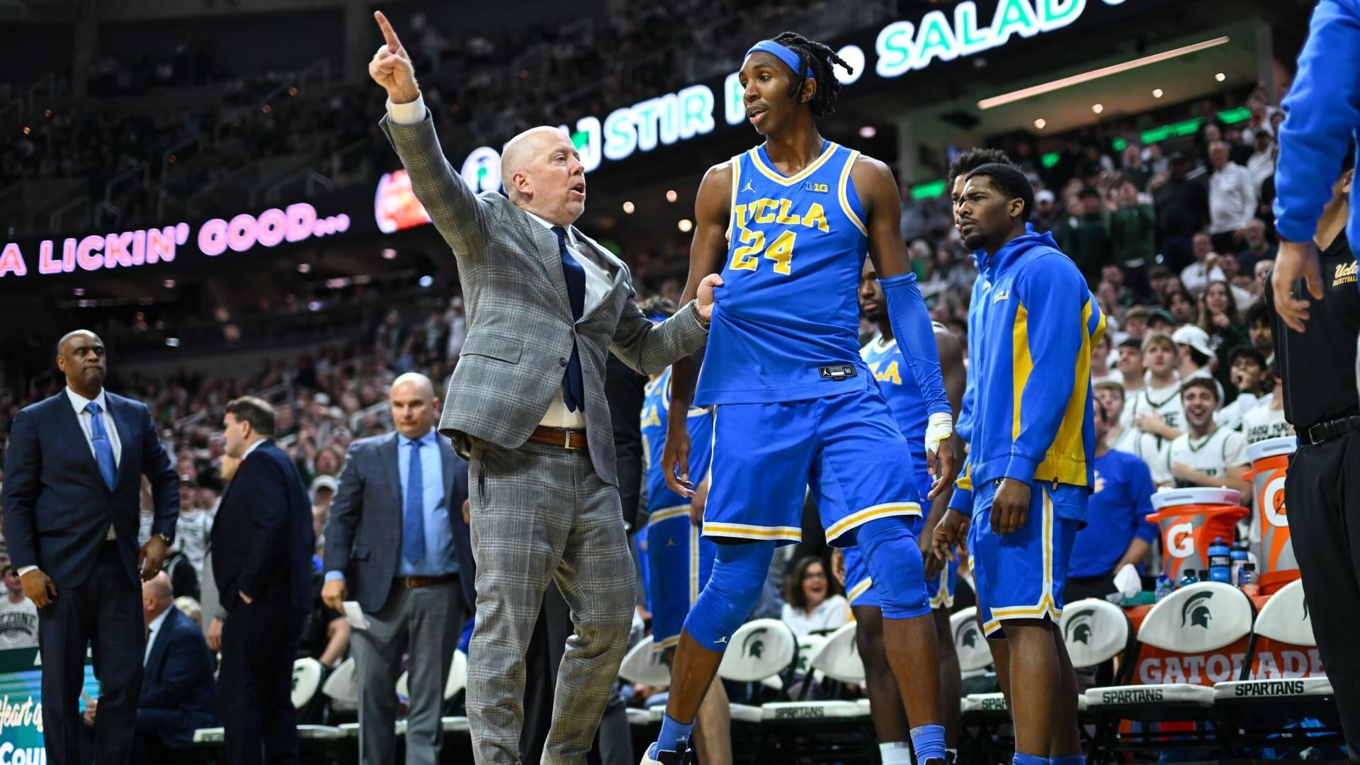 Cronin is wearing the stress of another unspectacular season on his sleeve. The first situation arose with UCLA trailing 77-48 with under five minutes remaining, when Bruins reserve center Steven Jamerson II committed a hard foul on Michigan State’s Carson Cooper as Cooper elevated for a transition dunk.